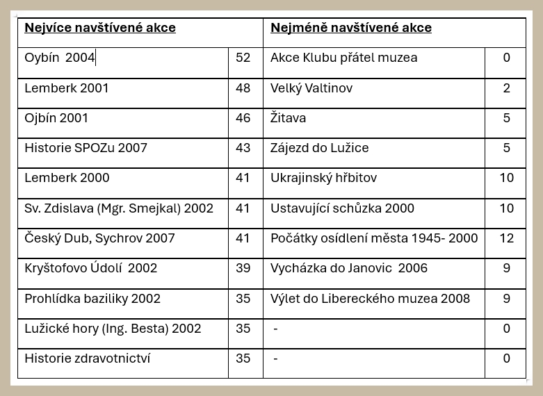 Celkem bylo uspořádáno 93 akcí s účastí 2340 lidí, takže průměrná účast na akcích byla 25 lidí. Z těchto 93 akcí byly tři výstavy (Velikonoce na SZ Lemberk, Vánoce v informačním centru a betlémy rovněž v IC), 14 výletů a zájezdů (Chrastava, Kryštofovo Údolí 2x, Česká Lípa, Kravaře-Zákupy, Dolní Světlá, Ojbin 3x, Český Dub-Sychrov, Turnov-Hrubý Rohovec, Mimoň 2x a Liberec) a 19 vycházek po městě a blízkém okolí. Na přednáškových schůzkách a vycházkách přednášeli především členové Společnosti: Jaroslav Oplt 29x, Václav Flegl 24x, Jaroslav Slabý 22x, Renata Černá 11x, Karel Uhrinčko 2x, Jaroslav Blecha, Dania Nosková, Květoslava Vlčková a Václav Kozlík 3x, Jindřich Růžička a Eva Drábová 1x. Na 14 schůzkách se podíleli externisté: pan Smejkal 3x, pan Šťastný, Ing. Besta a Mgr. Faltýnek 2x, pan Sovadina, PhDr. František Vydra, pan Šimonek, Mgr. Aschenbrenner, paní Procházková, pan Šindlauer a P. Beneš jedenkrát.