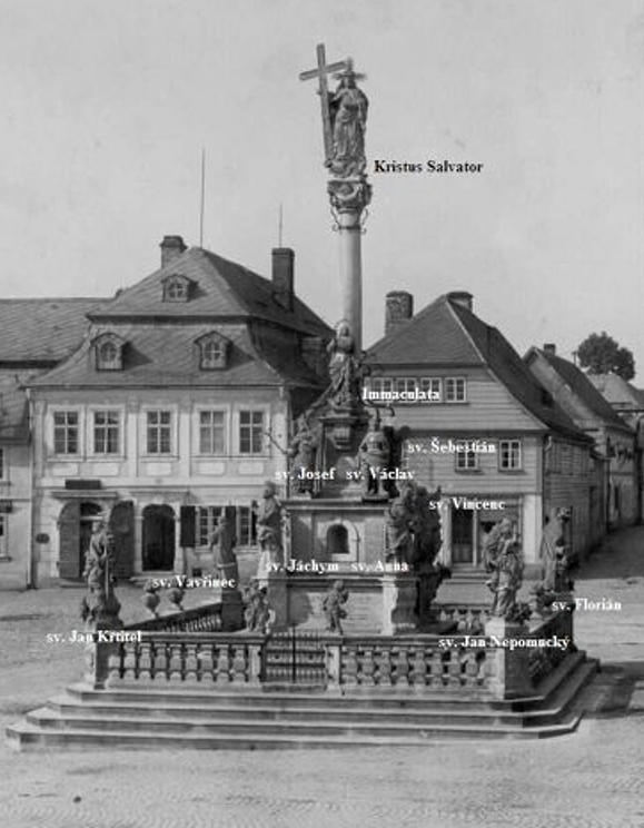 Morový sloup byl postaven v roce 1687 ke cti Ježíše Krista, Panny Marie a svatých Josefa, Václava, Šebestiána a Rozálie na poděkování za odvrácení velké morové epidemie roku 1680. Později byl sloup obohacen i o další sochy světců: sv. Jana Křtitele, sv. Jana Nepomuckého, sv. Floriána, sv. Vavřince, sv. Jáchyma, sv. Anny, sv. Vincence a sv. Vojtěcha.