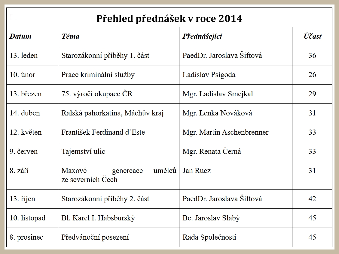 V roce 2014 jsme uspořádali celkem deset přednášek a besed s celkovou účastí 354 posluchačů. Návštěvnost se pohybovala od 26 do 45 posluchačů. Musíme s uspokojením konstatovat, že všechny přednášky byly přednášejícími zodpovědně a pečlivě připraveny, i když se některá témata přímo našeho města a nejbližšího okolí dotýkala pouze okrajově nebo obecně.